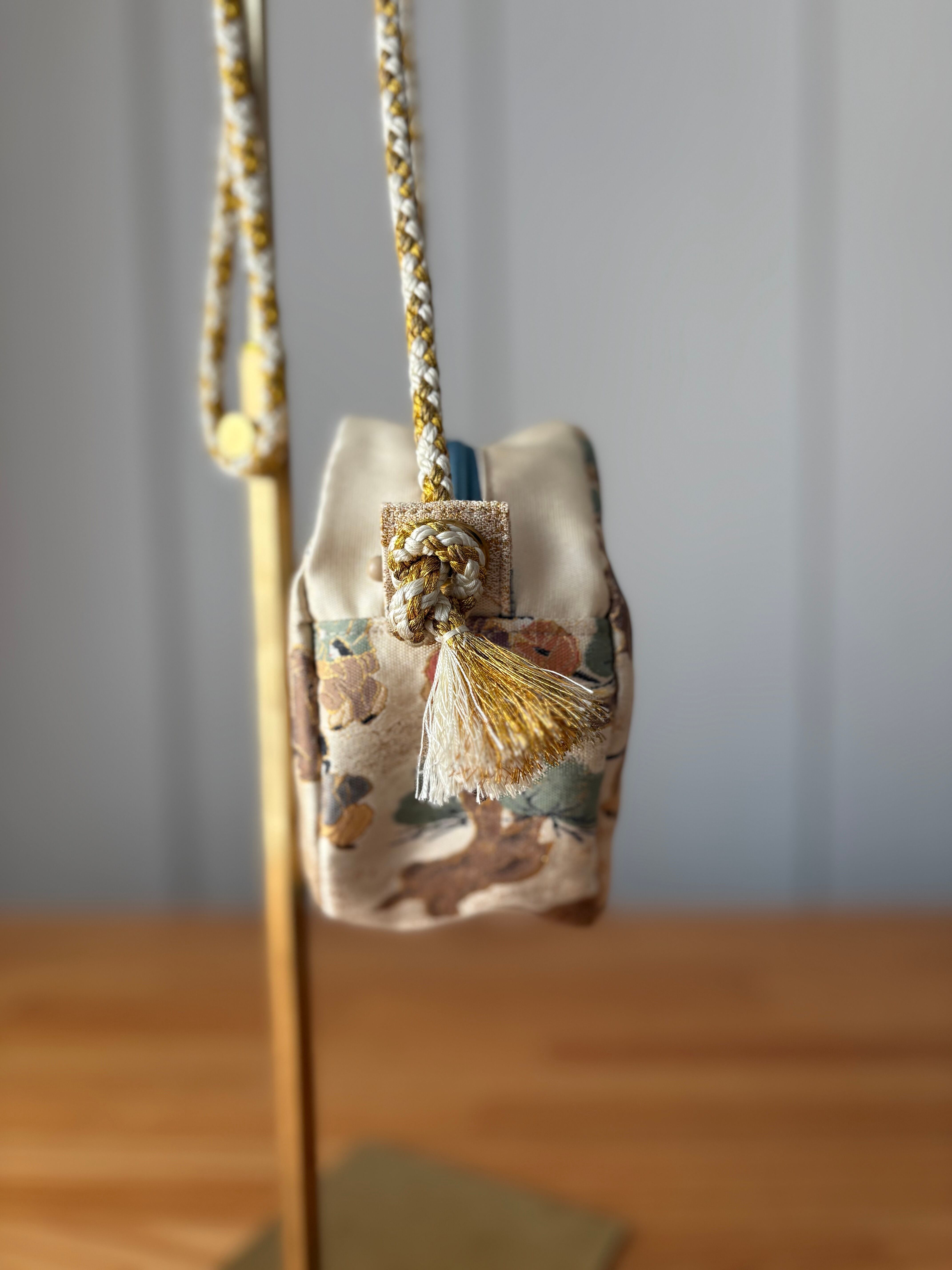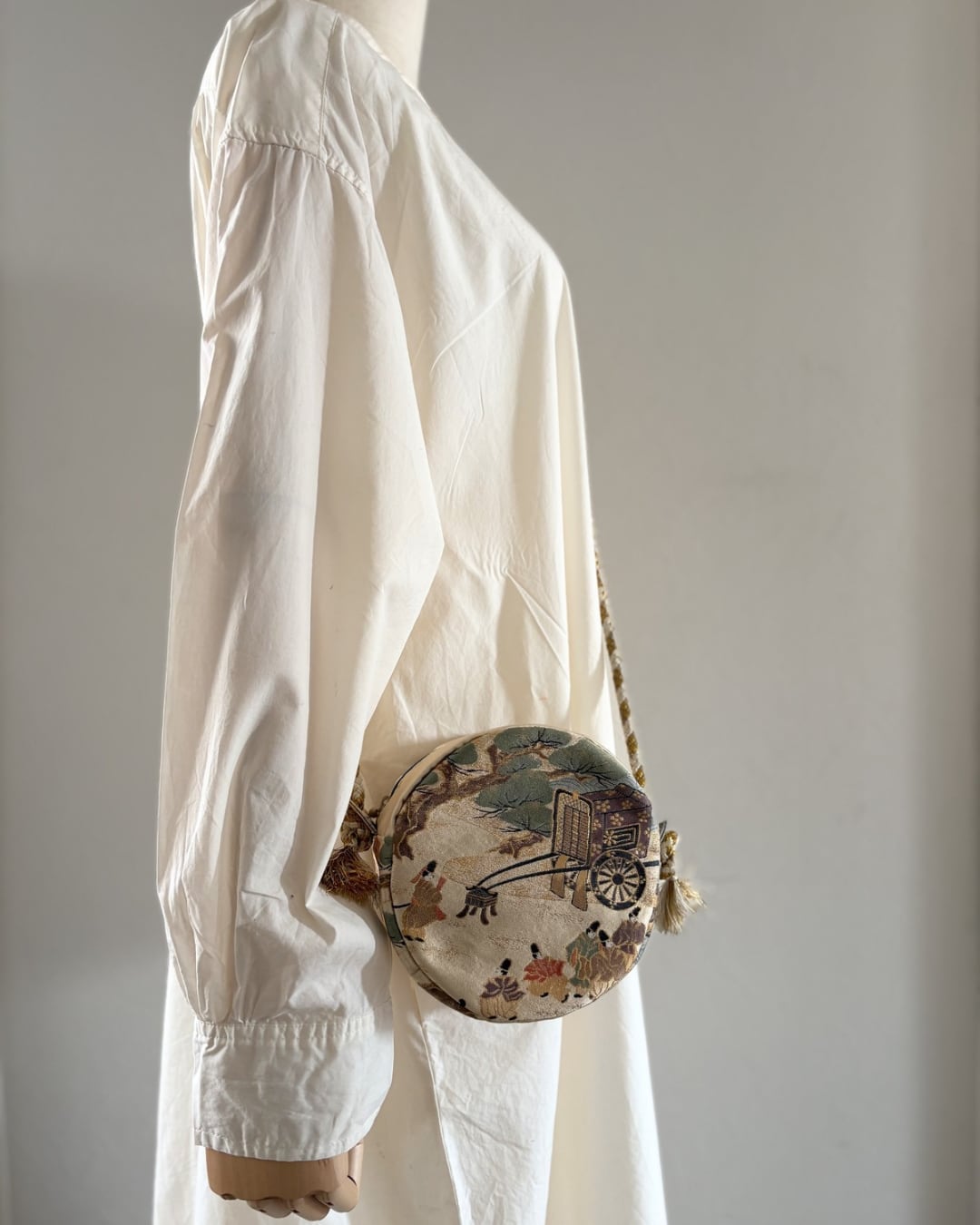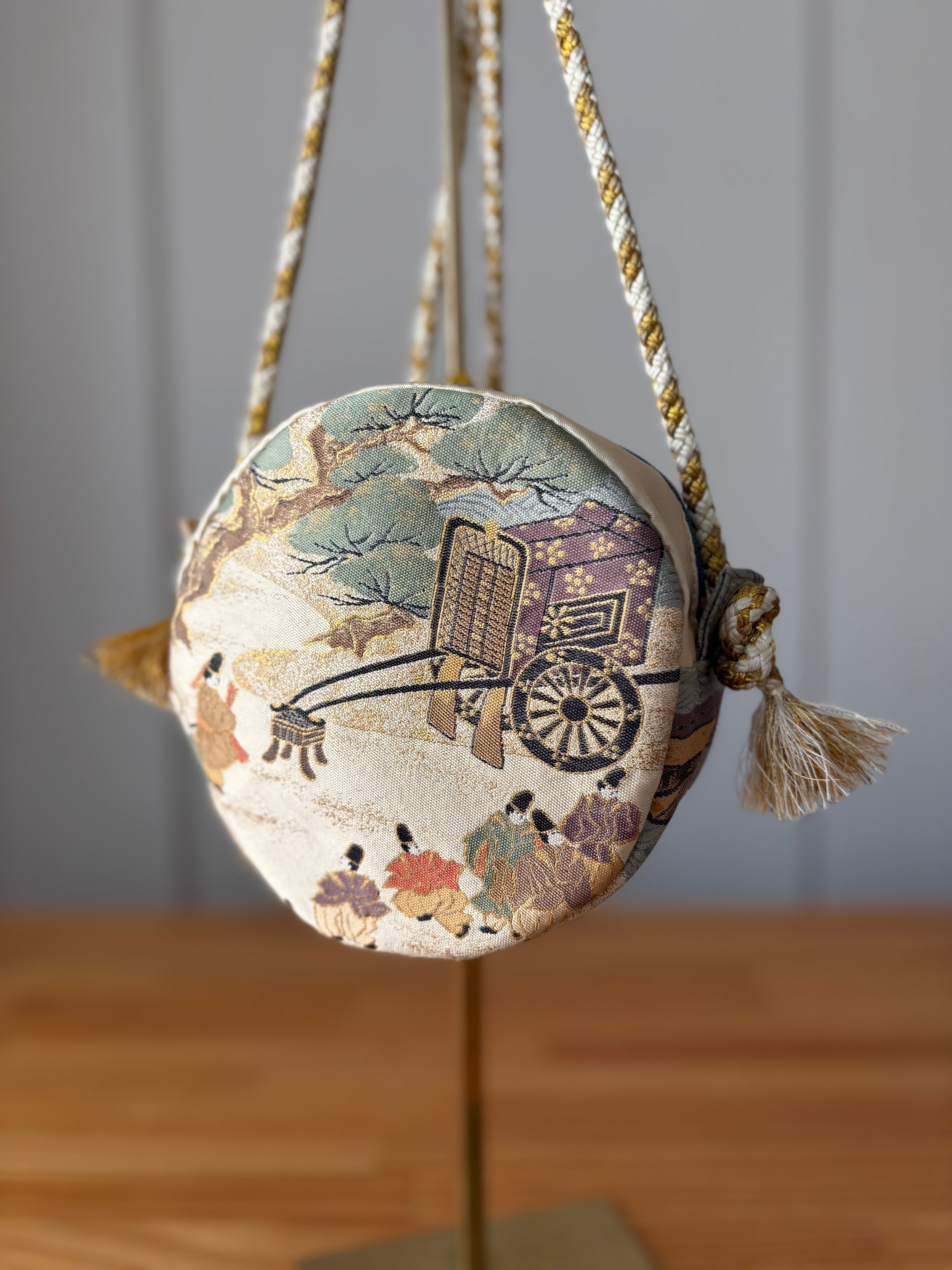大切に受け継がれてきた帯を、心和む丸い形のバッグにリメイクしました。